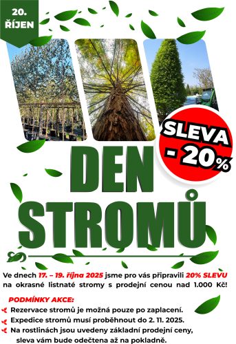 Ve dnech 17.–19. října 2025 jsme pro vás připravili 20% SLEVU na okrasné listnaté stromy s prodejní cenou nad 1 000 Kč!